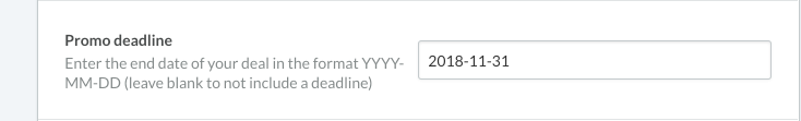 Creëer urgentie en verhoog de conversie door een afteltimer voor uw promoties weer te geven. Voer de deadline in onder de instelling Promo-deadline. De datum moet worden ingevoerd in de notatie YYYY-MM-DD.