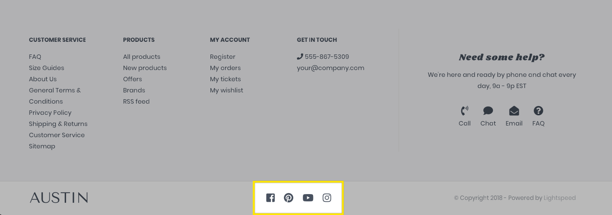 The following steps can be done by going to Design › Edit Theme › General › Footer › Social in your eCom back office.